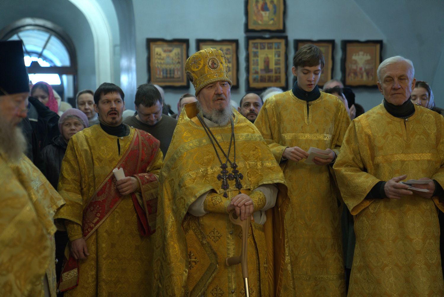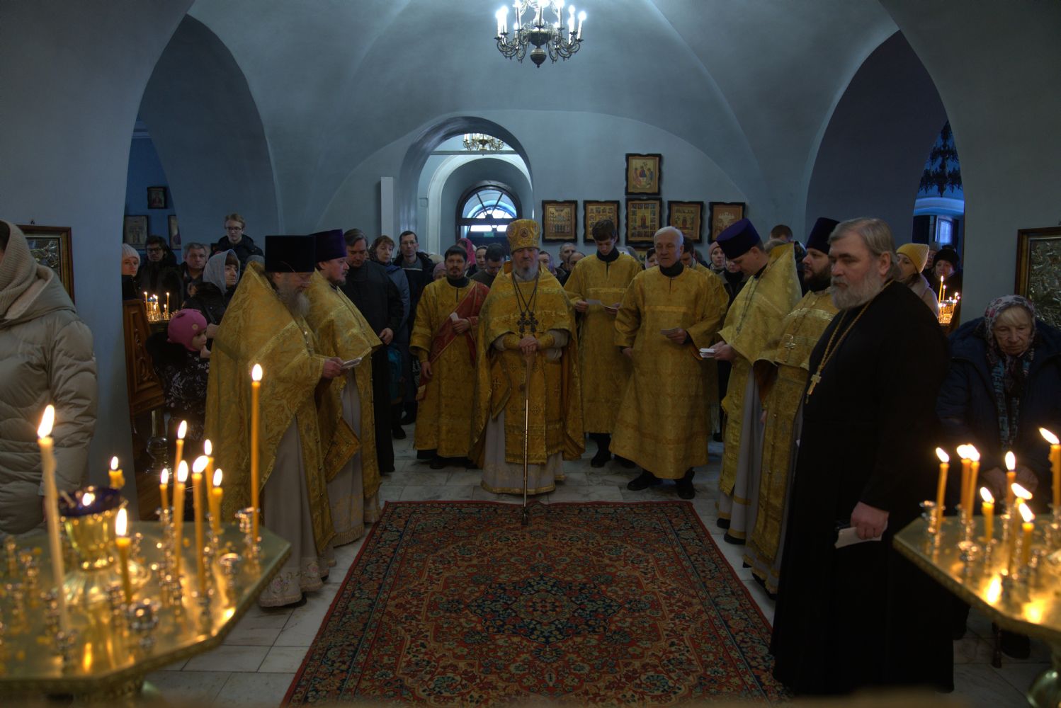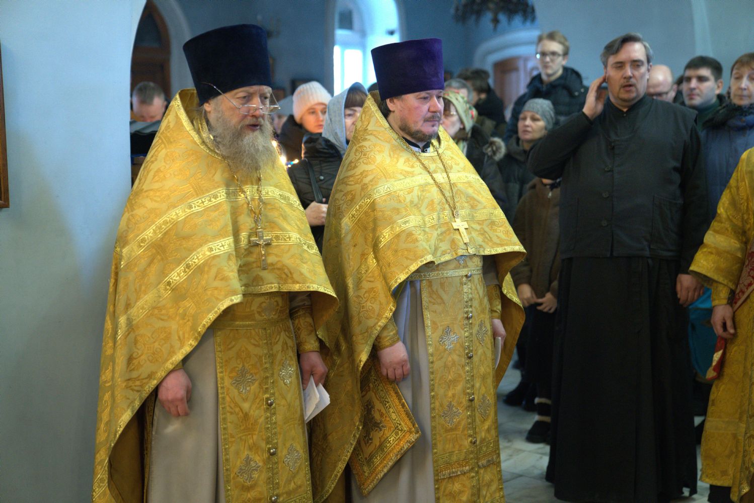 Богослужение возглавил настоятель храма митрофорный протоиерей Николай Яськов в сослужении духовенства храма. Несмотря на подготовительный статус дня, Литургия совершалась по воскресному чину, но с особенностями, приуготовляющими верующих к вступлению в великопостное поприще.