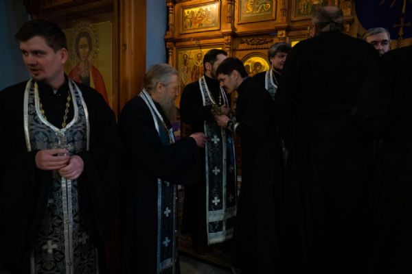 По традиции, священнослужители вышли из алтаря на солею, где на аналоях были положены иконы Спасителя и Божией Матери, а также напрестольный Крест . Настоятель, протоиерей Николай, совершив поклон перед святынями, обратился к духовенству и прихожанам со словом наставления, а затем испросил прощения у причта и народа со словами: «Благословите мя, отцы святии и братия, и простите мне, грешному, елика согреших в сей день и во вся дни живота моего: словом, делом, помышлением и всеми моими чувствы» . В ответ все верующие также земно поклонились настоятелю.