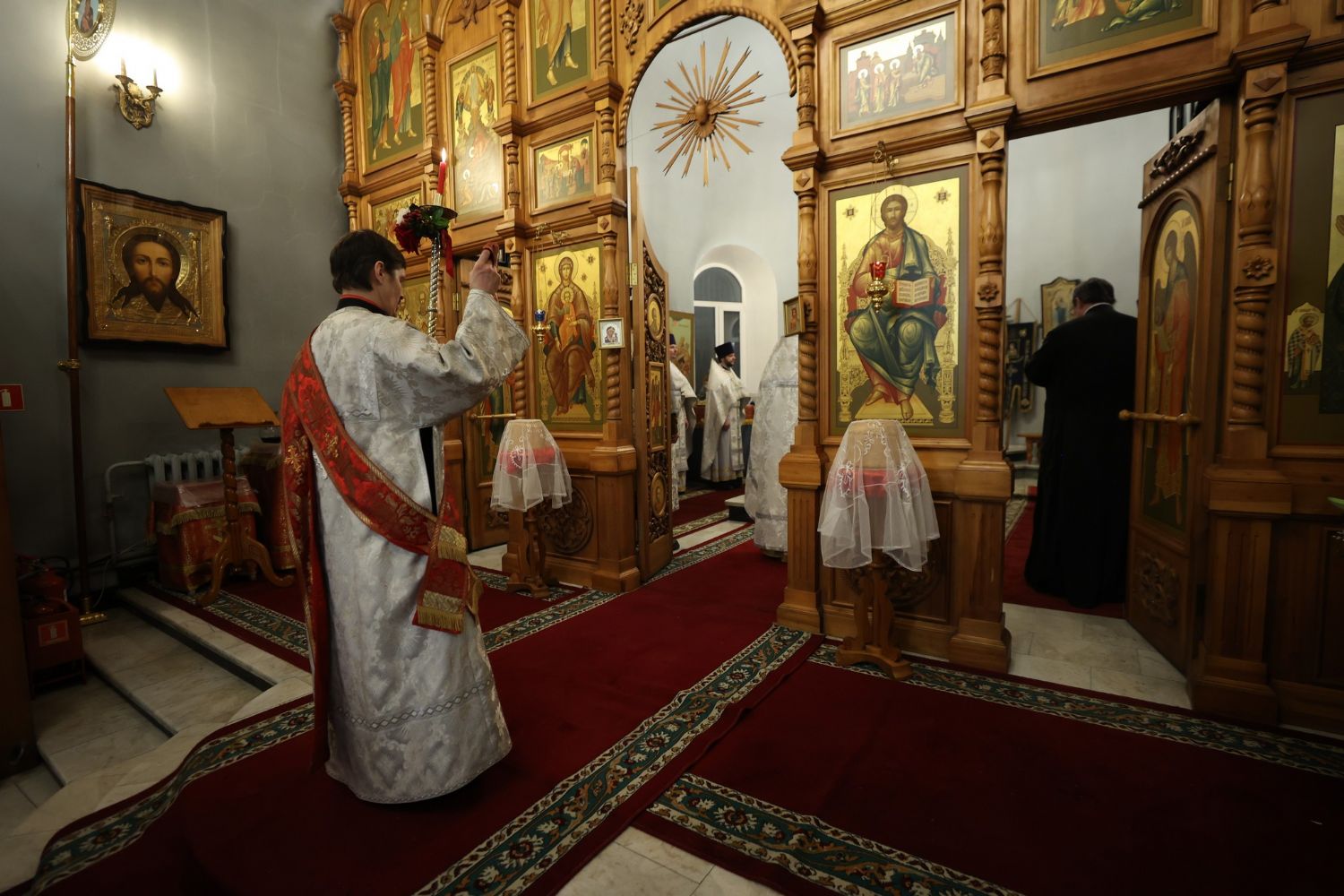 У закрытых дверей храма настоятель произнес начальный возглас: «Слава Святей и Единосущней и Животворящей и Нераздельней Троице» . Хор ответил «Аминь», после чего священнослужители трижды пропели пасхальный тропарь: