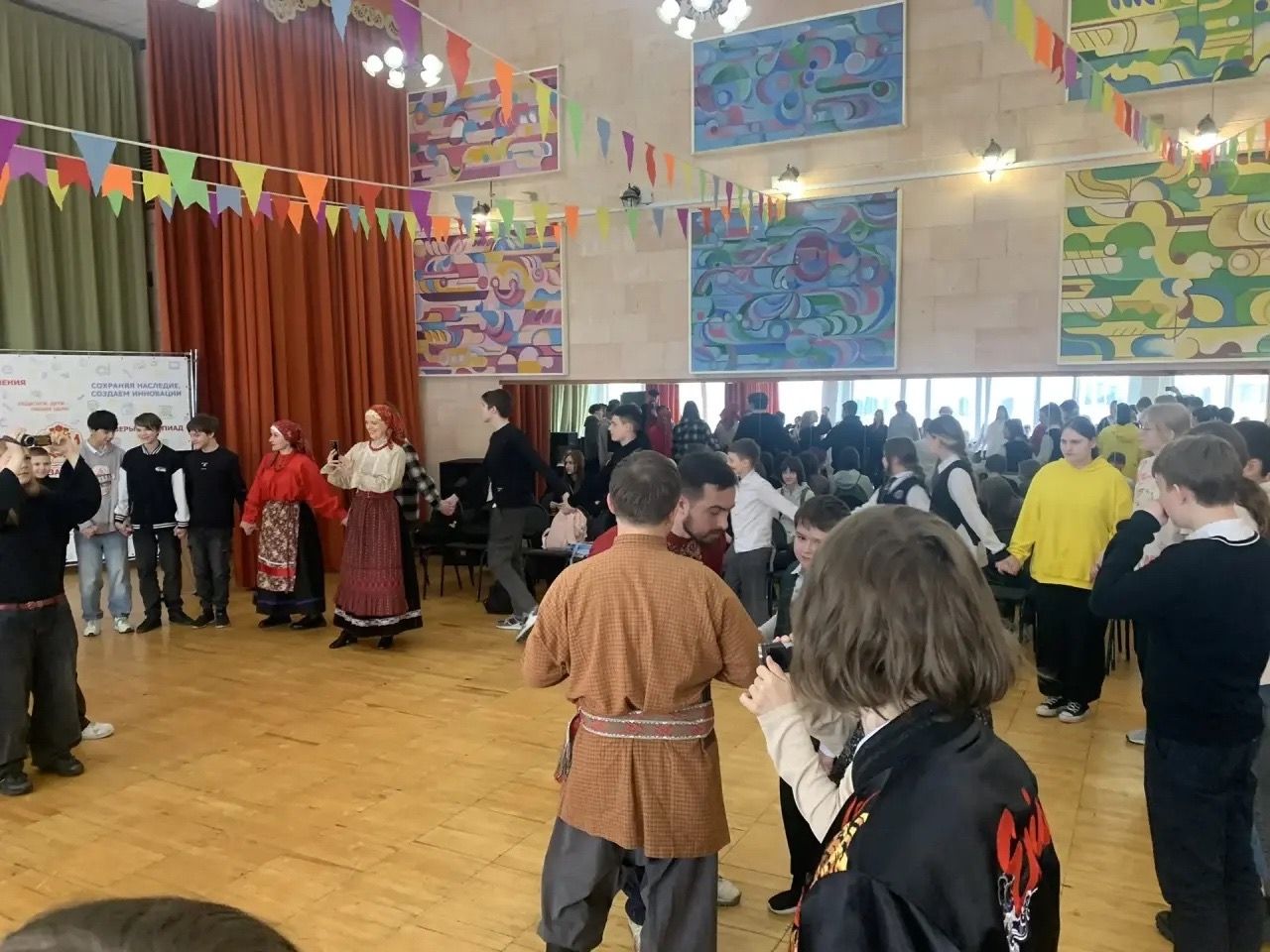 Учащиеся школы стали не просто зрителями, а активными участниками события. Дети узнали множество интересных фактов о русских народных традициях, прошлись разными хороводами — тем, что на Руси любили издавна, освоили несколько песнопений и с удовольствием поиграли в народные игры.